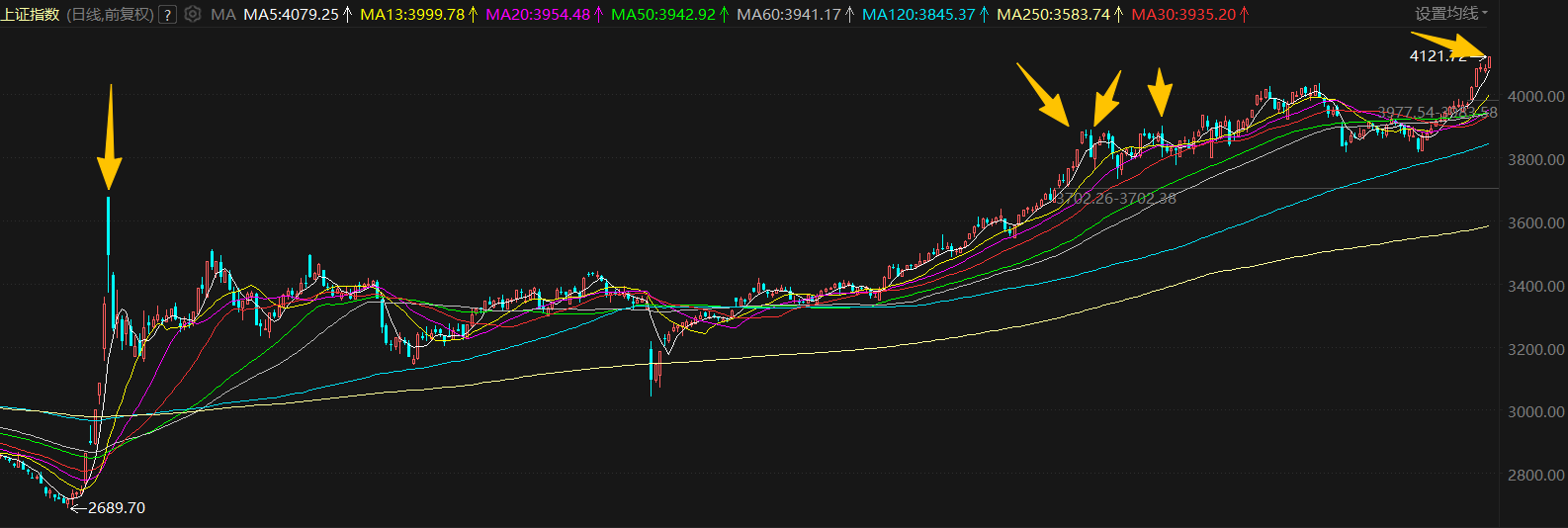 周一A股再创新高已无悬念,关键是新高之后怎么走?连阳这么多天,会不会调整起来幅度很大,手中个股涨幅不大的是继续持有还是逢高先出来,引发全民龙头战法的商业航天能否继续,今天文章中都会告诉你答案,先说第一个问题,新高之后大盘会怎么走? 从周五的走势看,上证收盘站稳4100点,两市放量至3.15万亿,这也是A股历史上第五次站上3万亿天量,前面四次全是呈现高点走势,所以明天需要记住一个口诀:新高天量不上涨,主力派发风险藏。