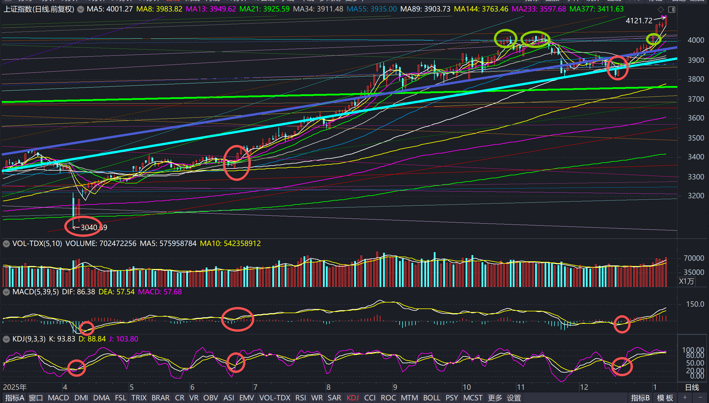 按《天赢居趋势线的计算和使用方法》,月线定方向、周线定结构、日线定节奏。当前大盘已完成对历史关键门槛的站稳确认:4018从历史强阻力逐步转为阶段强支撑,这是趋势由“试探”进入“确认”的标志之一。慢牛框架下,上方仍以紫色上轨线4260附近作为最重要的中期压力位,但4156附近有五条趋势线形成重要拦截位:
