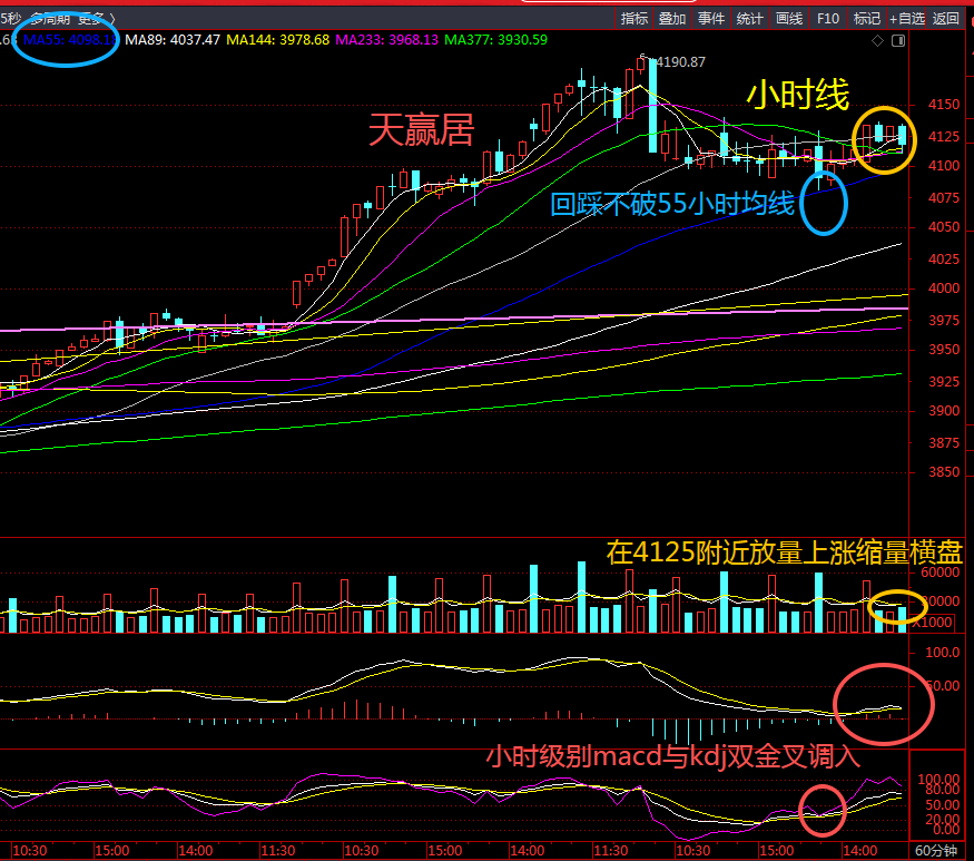 三、小周期确认:4125一线是“重叠共振位”,站稳即右侧确认:5日与8日均线死叉点约4122、34小时均线约4125、30分钟55T约4123、15分钟144T约4125。这些位置高度重叠形成“多体系共振点”。1月21日大盘低开后回踩13日线(4106附近)获得承接,随后向上突破4125引发60分钟级别MACD与KDJ双金叉,但量能不足导致冲高之后回踩。在回踩的过程中也没有破位4106和4090,所以推进方式更可能是强势震荡而非放量快攻。