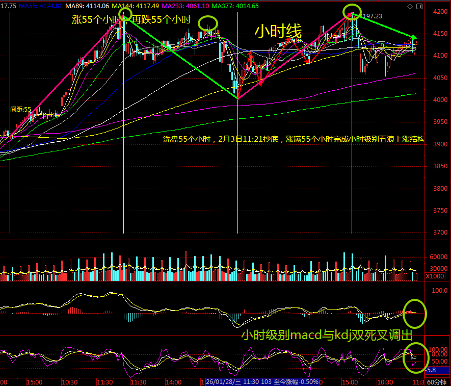 3月3日指数涨满55个小时的时候站不稳趋势线所在4192,所以进入55个小时的洗盘周期。在5天节点回踩到55日均线附近构筑双底反弹。冲上4129的颈线之后,两天的反弹延伸为三天,3月12日涨满13个小时之后完成反弹,准备继续洗盘。