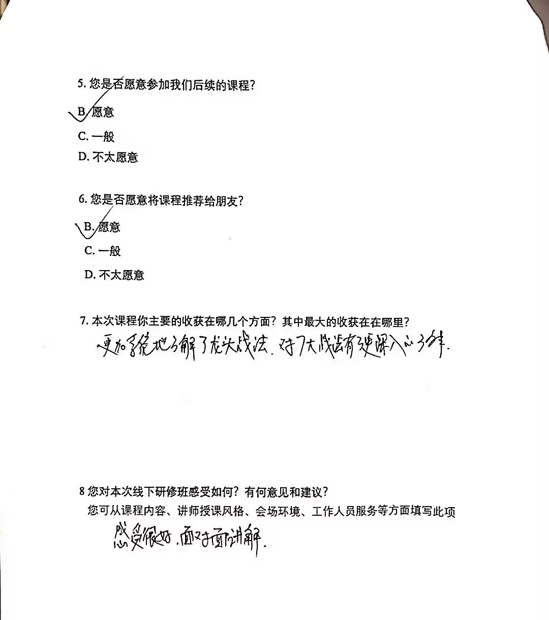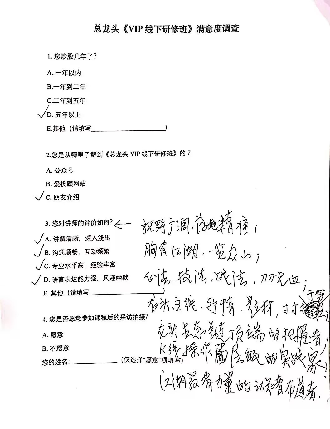 这位粉丝写了满满的好评和建议,感谢您的认真听课和宝贵建议,我们会不断改进优化课程,也希望您下次有空,参加复课,再学习一次,不断巩固知识,把《龙头战法》学好、用好。