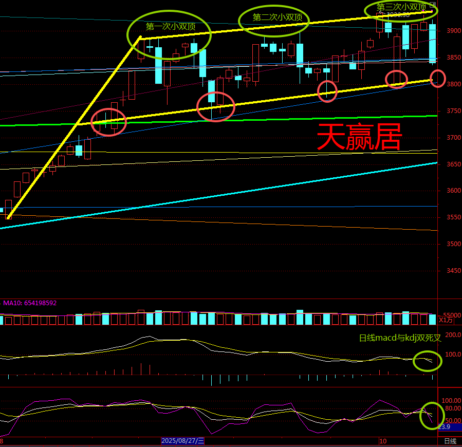 箱体与形态:沪指仍处3732—3905的箱体内运行,国庆节第三次冲顶后回踩,10/13在箱底附近反抽做了小双顶,随后再度回探箱底,整体仍是上倾矩形里的拉锯。