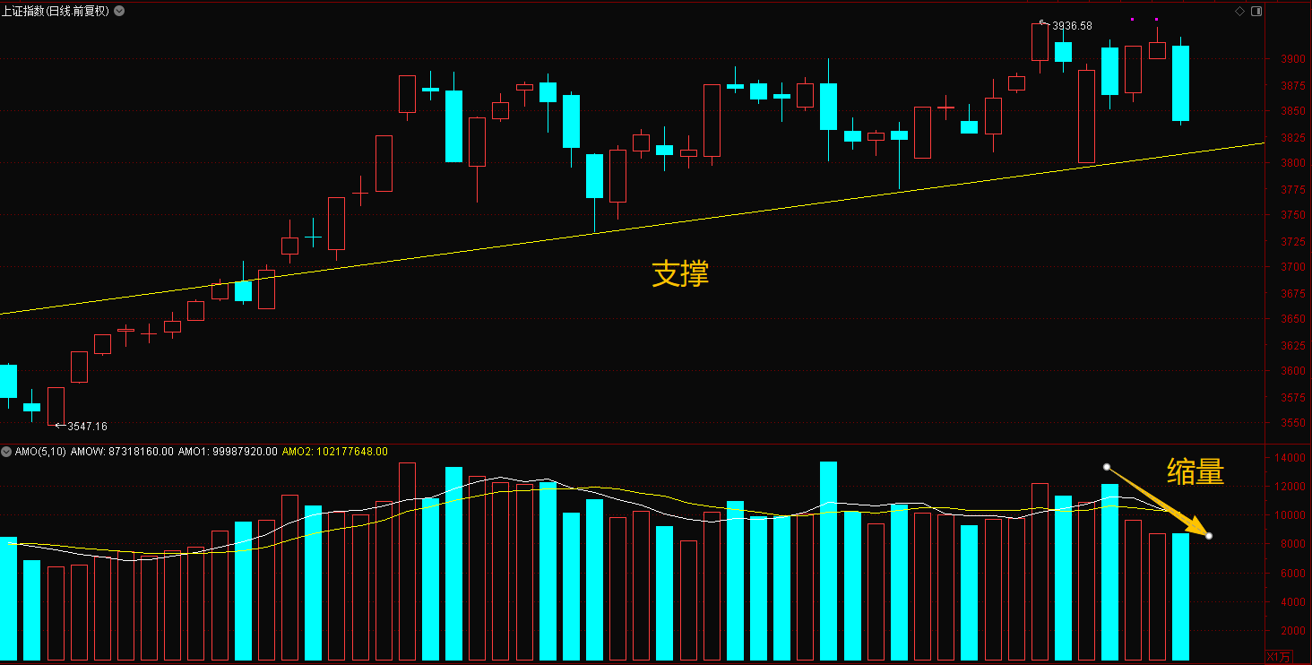 3、所谓市场自发行为,说白了就是该涨或者该跌,比如周五,尽管不能说该跌,毕竟很多人在周四晚上还是偏乐观的(比如我),但跌了也正常,并不意外,原因很简单,周三四两天的反弹乏力,量能收缩,周五砸下来完全说得通,找下方支撑的话,看图。