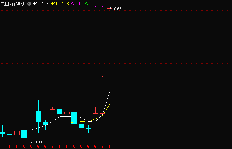 农行有多猛,看看它的年线就知道了,最近3年,农行的涨幅分别是25%、46%和60%,而前边13年加起来只有6%,何其魔幻。