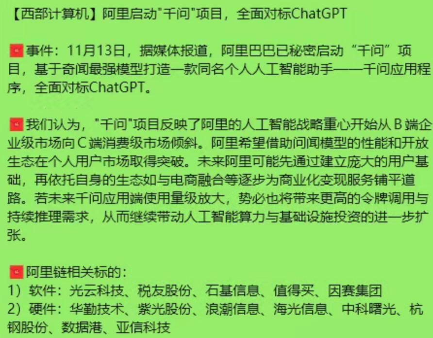 算力 - 模型 - 应用全链条都要跟着革新,阿里链标的可以重点盯。