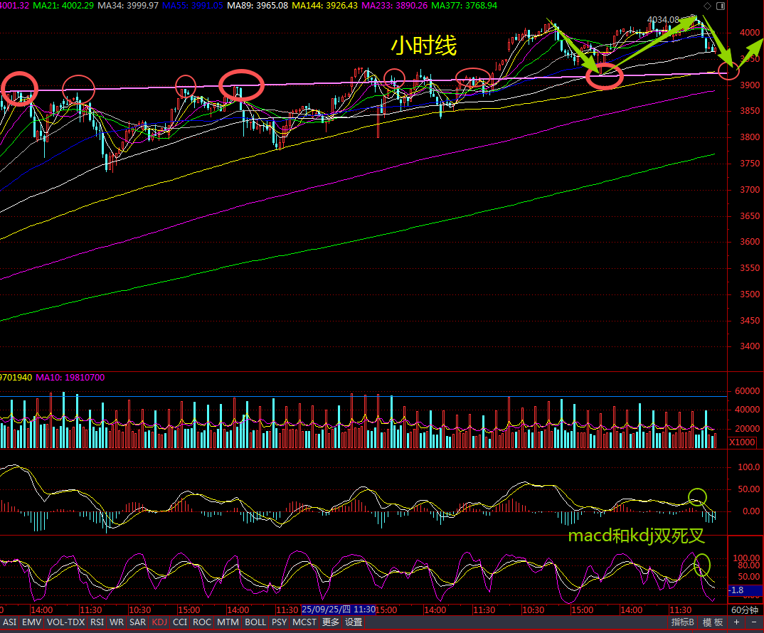 小时线确认A浪下跌到30分钟K线图144T均线3929之后B浪冲顶,然后C浪继续回踩144小时均线与紫色趋势线重叠的3925附近。下跌途中89小时均线3963提供中继支撑,MACD与KDJ在小时级别双死叉后释放调整动能。