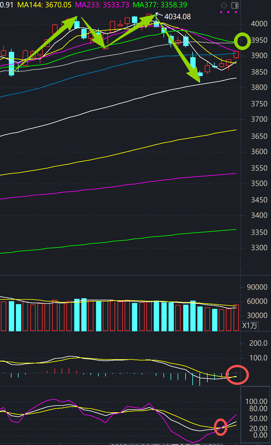 周线MACD、KDJ双死叉仍在,中期压力未消。