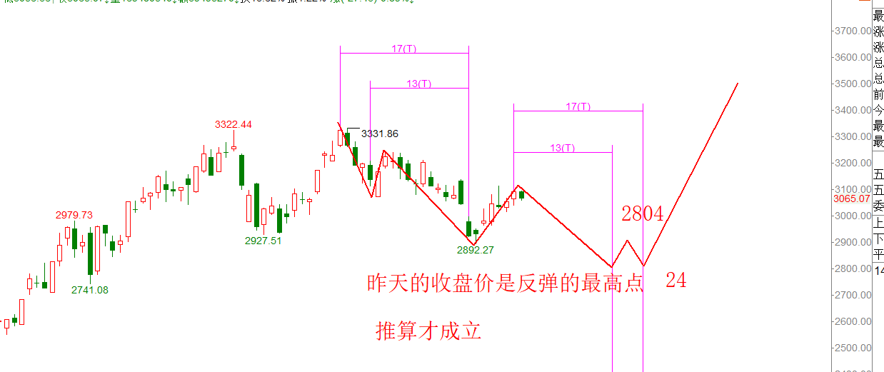 今天收了一根下阴线,还不能确认反弹结束,明天再跌,才能确认,只有确认了这波反弹的最高收盘价才能推算后面调整结束的时间,如果昨天是这波反弹的最高收盘价,那么调整结束的时间的是12月18号或者12月24号,首选是24号,前提是昨天是反弹的最高收盘价。