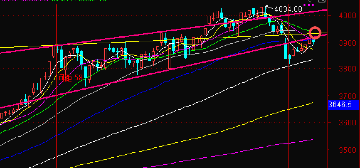 日线结构:受阻55日均线与13日均线交点3909,但还在5日均线之上震荡;MACD零轴下方红柱临界点,KDJ金叉——说明是修复非反转。上方21日均线和34日均线交点3941多线共振压制,未放量越过前,反弹空间受限。