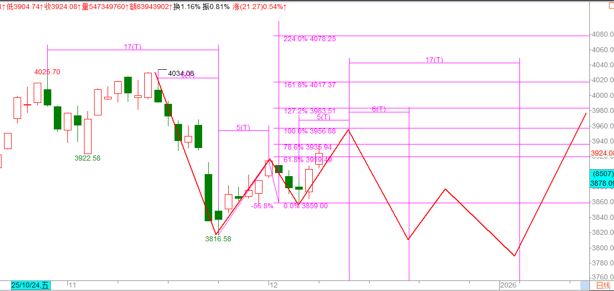 从短线看如果不能突破站稳3956依然是B浪反弹中,那么调整结束的时间依然是12月底,突破了,结构需要重新修正。