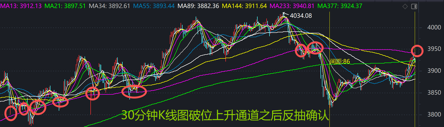 这一轮从3816启动的反弹,30分钟K线图已经累计到86根K线附近。按天赢居经验,反弹周期接近“89”时往往更容易进入调整段,因此12月9日10:40附近要特别留意回踩风险。时间上虽然还有余量,但空间上已到3942,而本次若无法突破4018,就更要承认一个事实:12月份处于BC衔接周期,C浪调整是绕不开的;同时《天赢居炒股规律总结》也强调,调整周期里的反弹往往在8—13个交易日更容易进入调整阶段——这就是为什么越到反弹末期越要冷静。