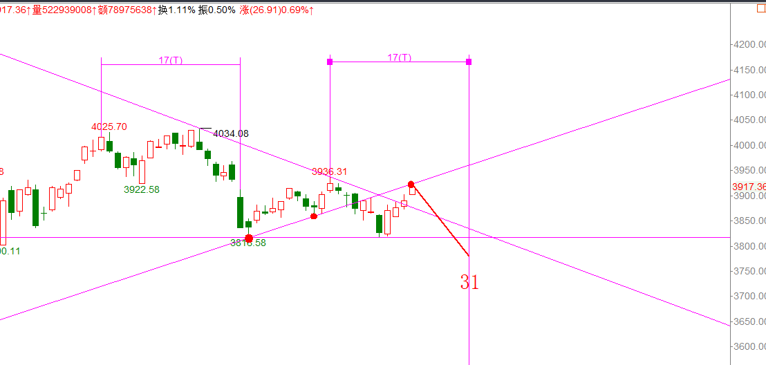 今天再次收阳,连续4连阳,你以为要创新高了,调整来了,你以为开始C浪调整,连续反弹了4天,今天刚好触碰了前期的支撑线,低点-低点的连线,前期是支撑位,打穿后转化为压力线,这里不能突破,还是会回调到12月31号(依然作为首选),走势如果强势突破了再看。另外一点,这个盘面还是比较乱,个人认为操作性并不是强,建议观望,等确定性的交易机会,留有后手。