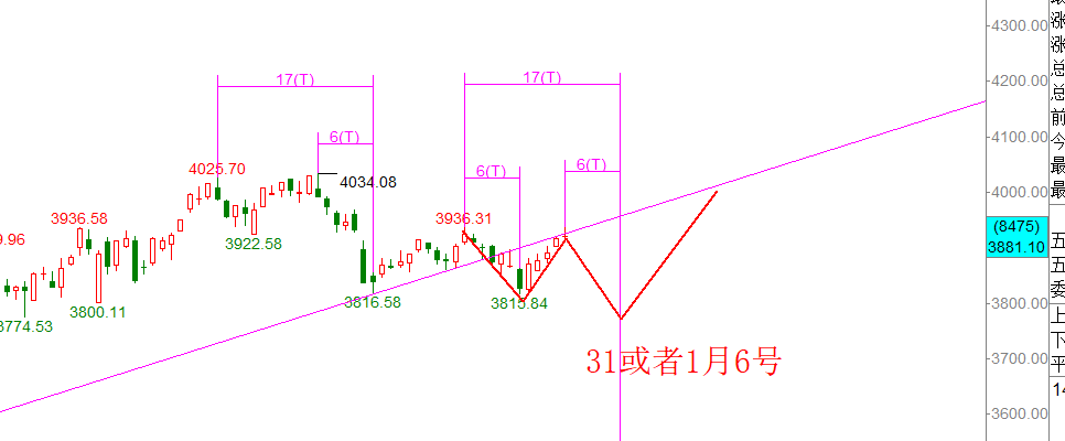 指数:看下图,跌6T后开始反弹,调整的时间相等,但是空间并不相等,今天刚好触碰到线上,理论上反弹结束,从时间看点看还是首选12月31号或者1月初,空间上破3815更趋于合理,不管是时间还是空间,谁先到达,即可逐步低吸。