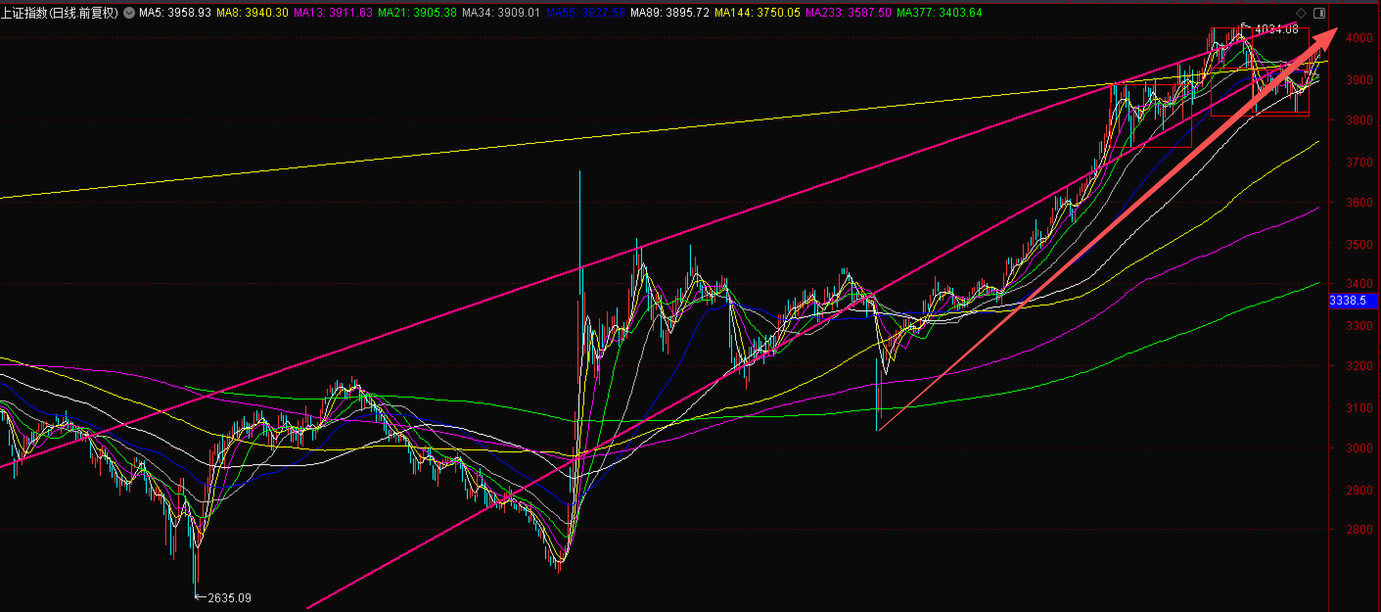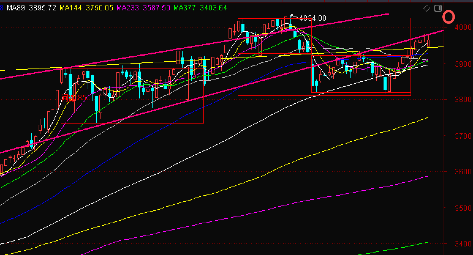 10月30日和11月14日两次站不稳月线黄金目标线4018确认日线级别洗盘之后就提前告知21天节点12月15日处于低位就抄底,事实上延后了一天半,12月17日中午在科技硬件崛起后运行第三次冲顶。途中3888附近是均线和趋势线密集区,突破后确认冲顶。