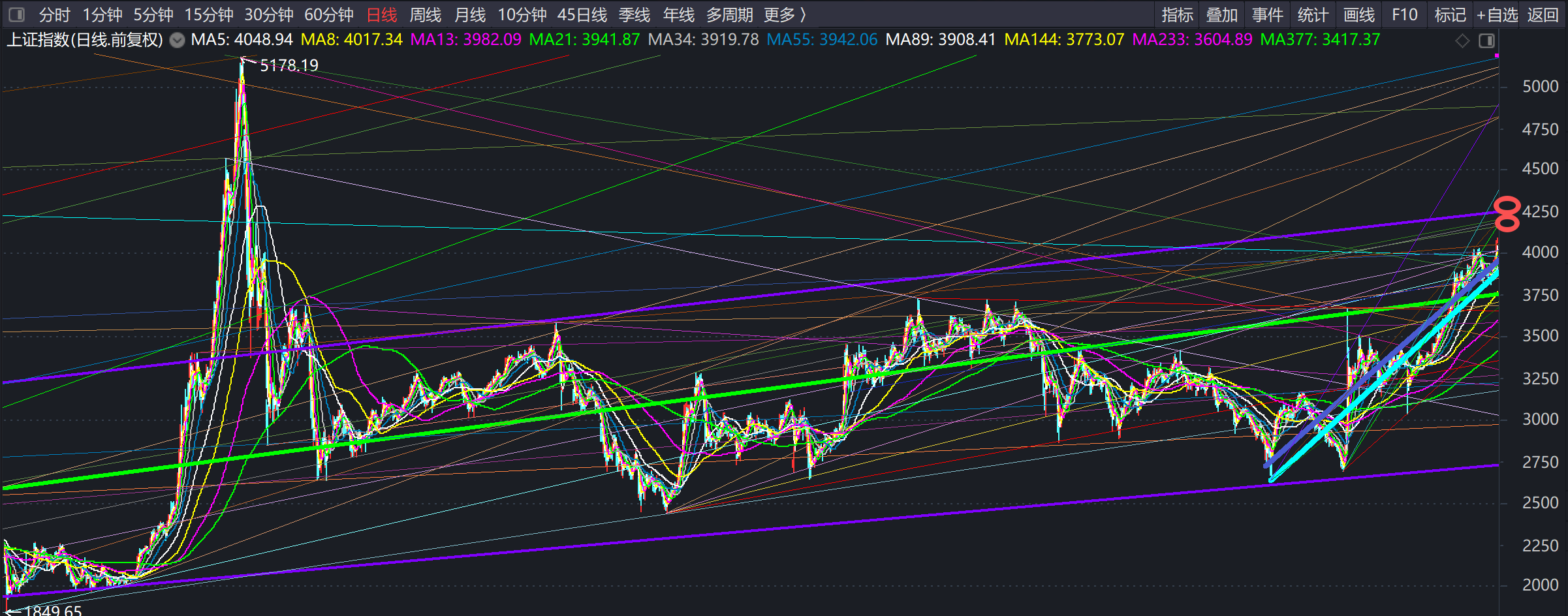月线级别2024年完成突破,并在2025年4月7日回踩不破得到确认。按照《天赢居炒股规律总结》的框架,大周期趋势一旦从“盘整”转入“上升”,小周期的波动更多是筹码交换与节奏差异,大方向对准慢牛上轨4260附近,但在4186附近有五条趋势线拦截。