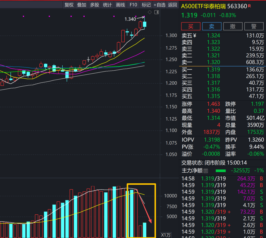 说到大盘的话先看一张图,这是A500ETF华泰的走势,很明显昨天就严重缩量,相信很多人都知道,这轮增量资金就始于A500ETF,它的缩量是否意味着被指导了?不管怎么样这都是个观察点,如果它继续缩量,则行情不排除会转入震荡格局,倘若仅仅只是控一下节奏,随后继续放量,那么行情还要接着奏乐接着舞,当然刨除这个影响,单纯看指数的话,这里的回撤力度还算正常,至少不能据此说行情结束,但是量能很关键,接下来还能维持在3万亿以上则一切照旧,快速缩量则调整周期适当延长。