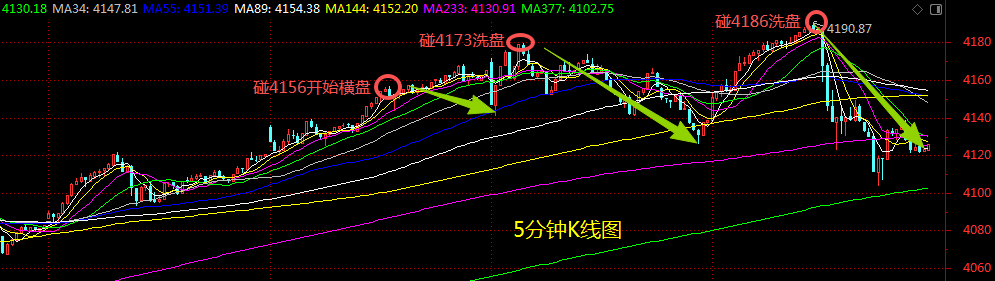 1月12日冲涨到4156时,我们就明确提示“碰线就会搓洗”;洗好之后再去碰4173仍会搓洗,之后再去碰4186继续搓洗。到了1月14日上午,我们提前画出5分钟K线图,提醒天友们即将冲向4186,并用绿色箭头标注“碰4186之后的搓洗路径”。当天盘中虽然多上冲了13分钟、并多涨了4个点,但随后走势依旧按图兑现。这种提前画出来的走势,并不是靠消息猜测,而是来自结构与趋势线的客观约束。因为价格已包含一切,这是技术分析的基本前提;而密集区的运动规律,也恰恰决定了这里更需要“纪律”。