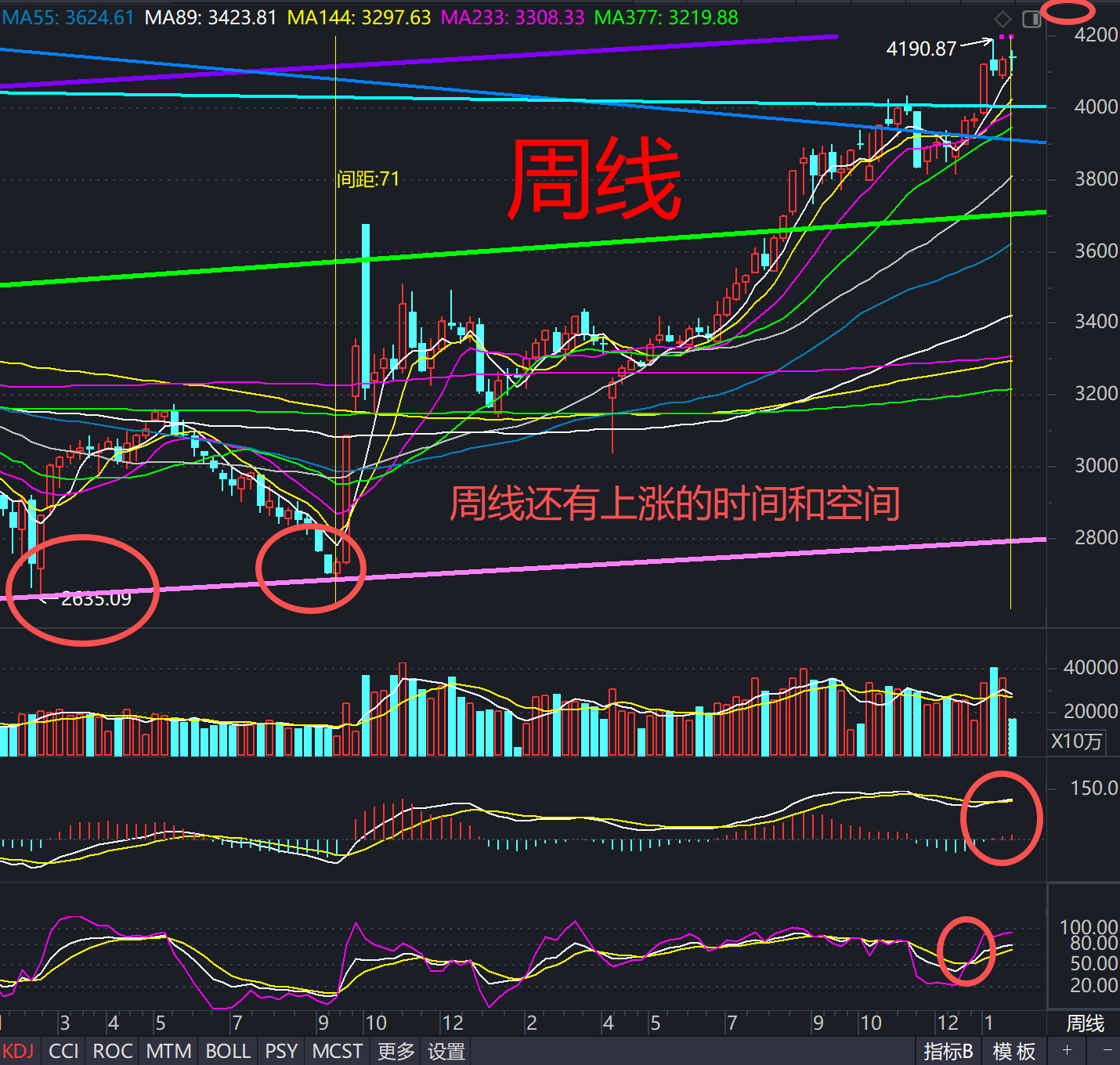 目前上冲到4186附近五条趋势线相交区域按计划洗盘,之后开始春季行情后半段:34天节点对应2月4日前后(立春节气附近);55天节点对应3月13日前后;若按“台阶式上移、箱体中抬高重心”的慢牛打法,本轮更像走55天周期:先把4000点上方夯实,再去磨上轨与年度级别趋势线4260。