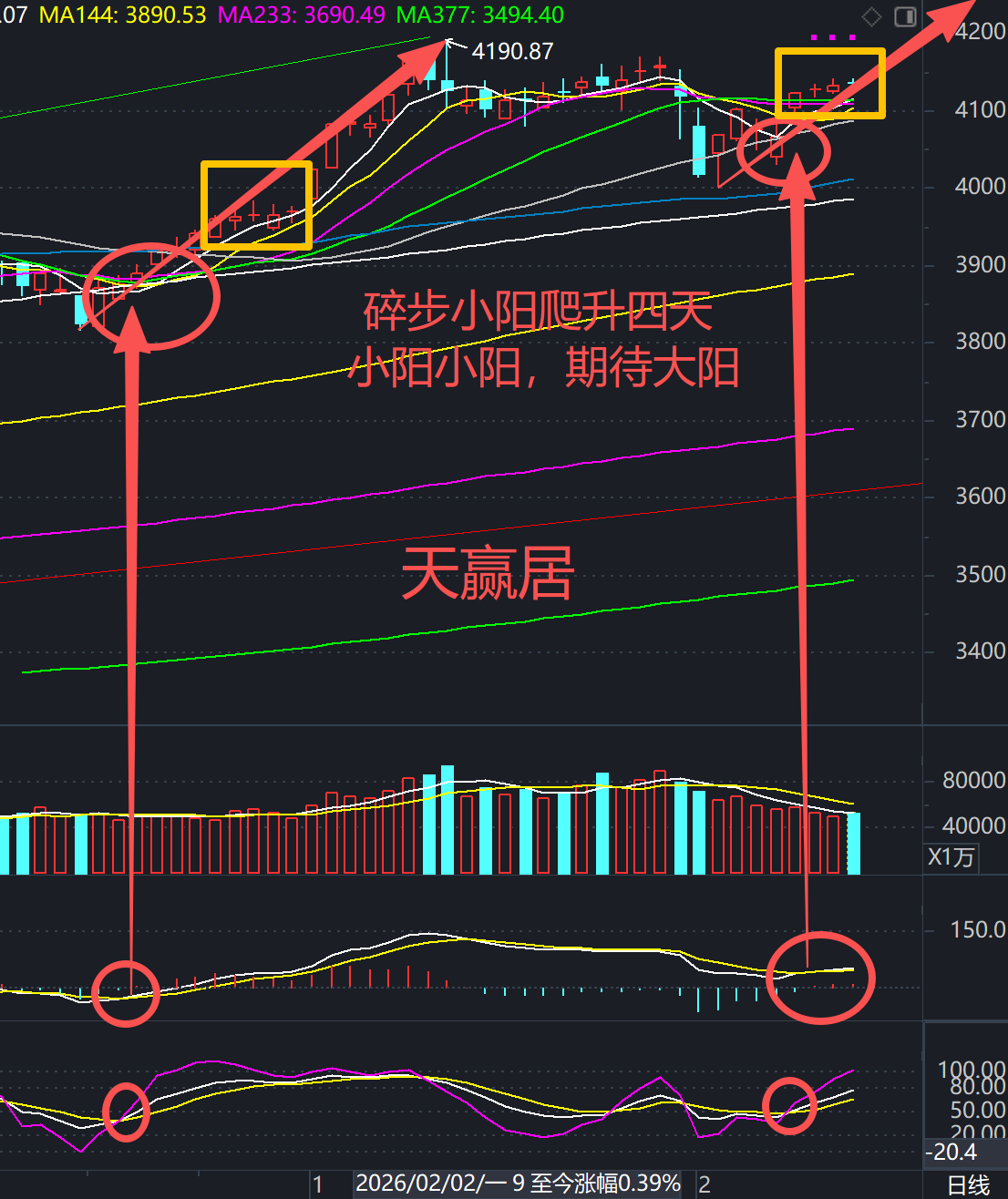 慢牛通道内的突破4113(颈线位 + 均线密集区)并连续四颗星站稳。碎步小阳爬升之后有望继续冲向紫色上轨线4260附近。所以节前的任务很明确:先把4113守住,再把4160/4186当作“能否顺利上台阶”的观察位;节后量能回流时,再看向4260。