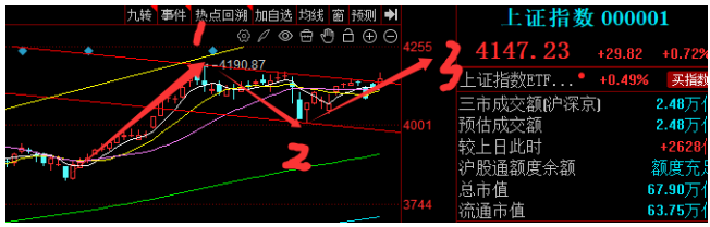 上证指数昨日继续向上突破!这里子三浪上涨结构雏形已现!突破站上三天为确认突破!所以本周五前市场依然可以站上下降通道上轨则视为这里子三浪上涨结构确认,看图: