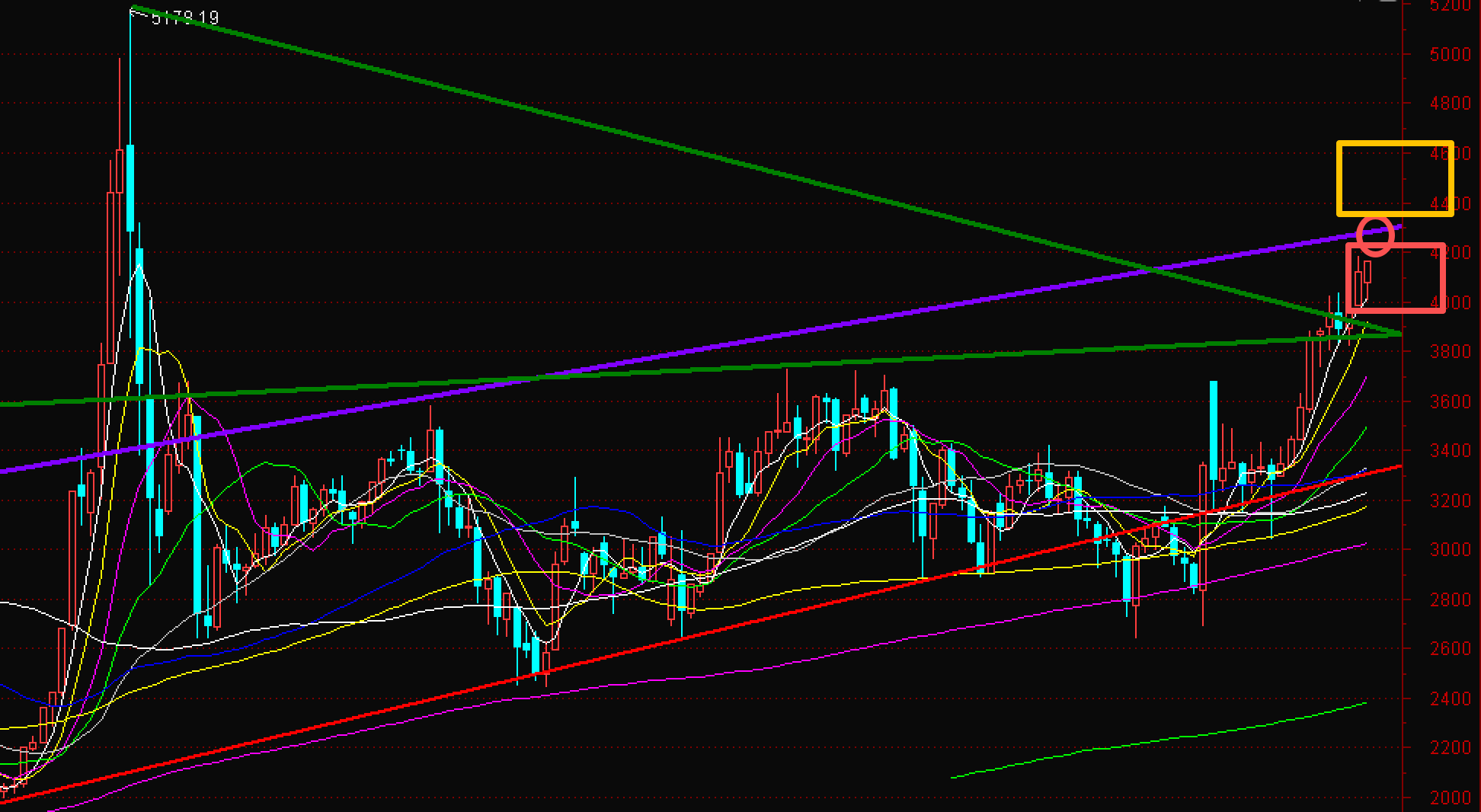 短线方向上,有两个分歧:其一,市场在科技进攻性品种如通信设备、元器件、半导体以及有色资源等带动下直接右侧突破4260并继续冲涨,然后借助4260一线高位震荡。其二、遇阻4260后下行消化,但六条趋势线相交的4018与绿色中轴有强大支撑,所以多半还是箱体震荡。