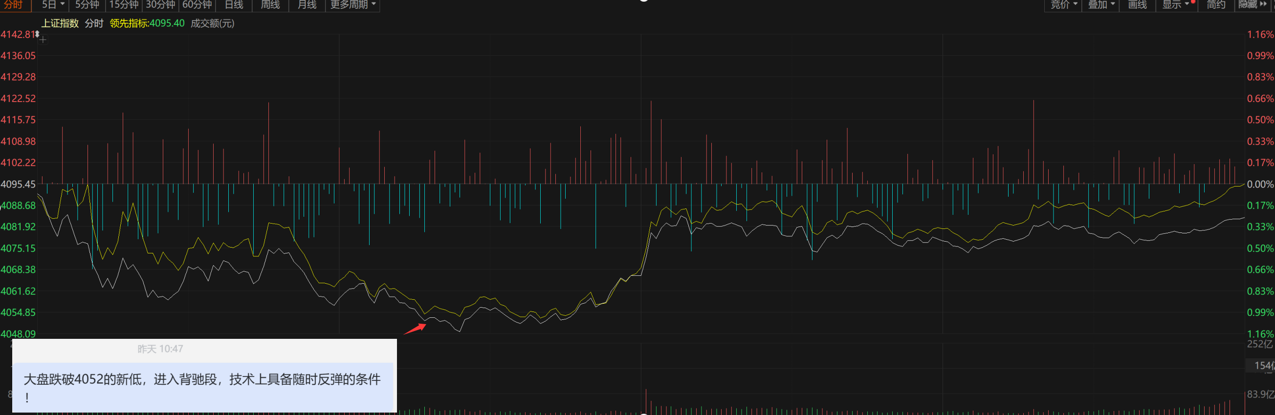 周一早盘,大盘创出新低后,王者再次提示大盘有反弹要求,五分钟后反弹开始,三针探底,也说明4050附近存在强支撑。