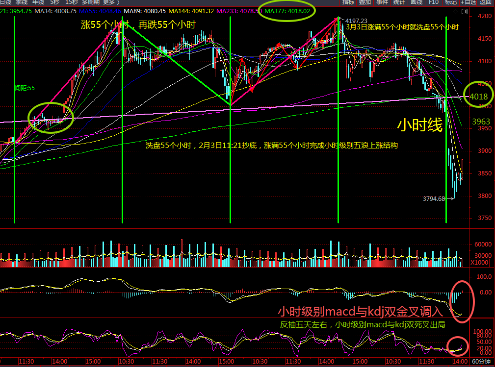 回头看这轮春季行情,2025年12月16日启动后,我们第二天就大仓位跟进有色金属,之后三个波段都是在五条趋势线相交的4186箱顶附近出局。3月2日,指数在小时级别五浪涨满55个小时之后,已经明确给出了55个小时洗盘、回踩144日均线的预期。只是后面破位牛市斜率线,导致洗盘级别升级,于是大盘进一步下探到黄金分割0.382分位、233日均线、前期高点3731,以及55周均线3720和13月均线3745共振支撑区。在这种情况下,13天节点附近先出现一波反抽减速,再去完成21天节点附近的止跌确认,就是更合理的运行节奏。