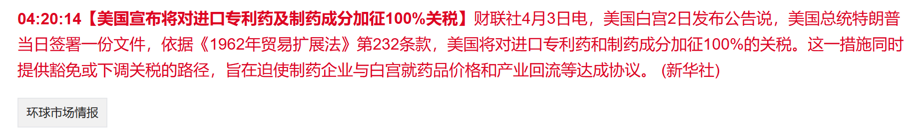 屋漏偏逢连夜雨,盘后又一记重锤砸向A股创新药板块。美国白宫宣布,将对进口专利药及制药成分加征100%的关税。此举旨在迫使全球药企将生产线迁回美国,以控制药价并促进就业。