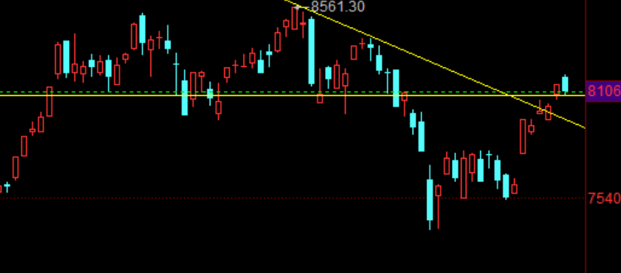 另一个是,目前完成了一个对顶底互换位的突破回踩。也就是深指的14500和中证1000的箱体下轨8075。同时这里也是5天线。