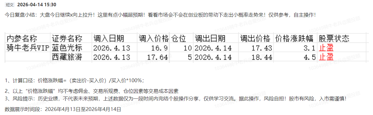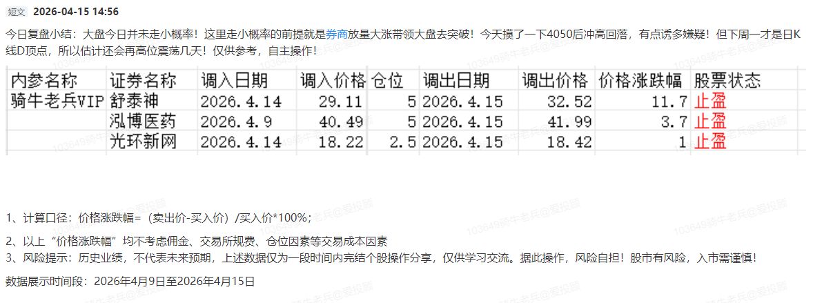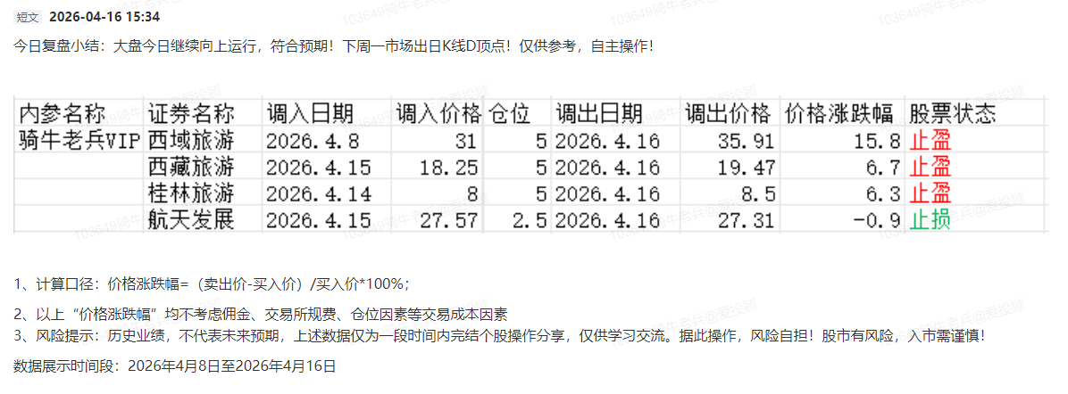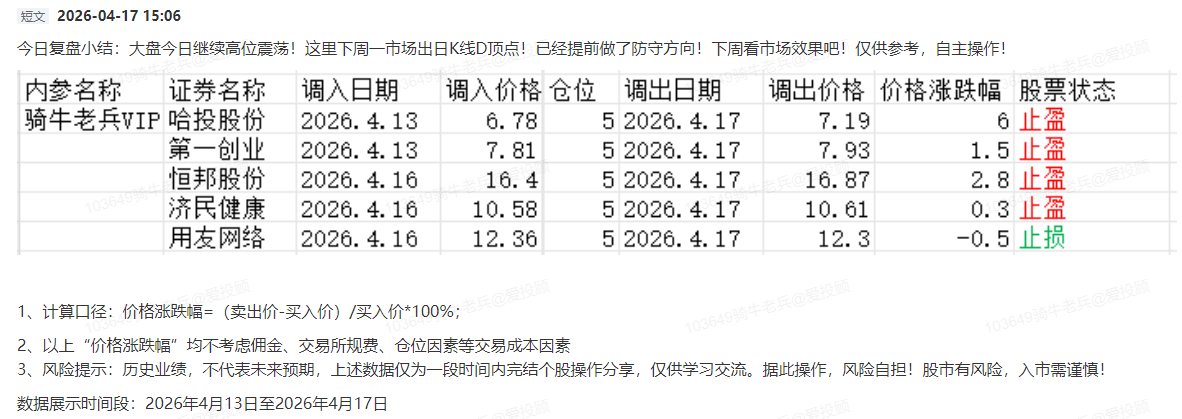 以上为本周已经完成的所有交易!本周老兵给自己打80分!本周总共完成了23笔交易,其中大赚5笔,小赚12笔,平手出局2笔,小亏4笔(亏损都在1.5%以内)同时,个股也都有周内不断的做高抛低吸降低了不少成本!这样的成绩单VIP圈友们都是非常满意的!各位老铁再接再厉,与老兵团队一起共创辉煌!(今后每周周末都会把当周的所有已经完成的交易发上来让大家学习)