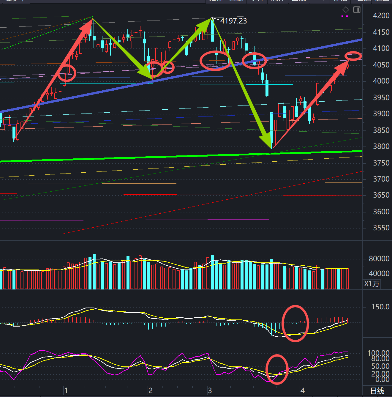 再看趋势线与均线。今后两天面对4075或4082一带的结构压力,小洗盘要看144日均线4018与144日均线3981的支撑带。现在下方短均线已经收回,上方中期均线与趋势线密集区尚未完全化解,所以是上涨之后的正常换手与消化。只要144小时均线4018不破,大盘仍按小时级别高位强整理对待;若放量突破4082,则说明这轮整理完成,大盘有望继续上攻;若失守4018,还有144日均线3981的支撑,依旧在日线级别主升浪之中。