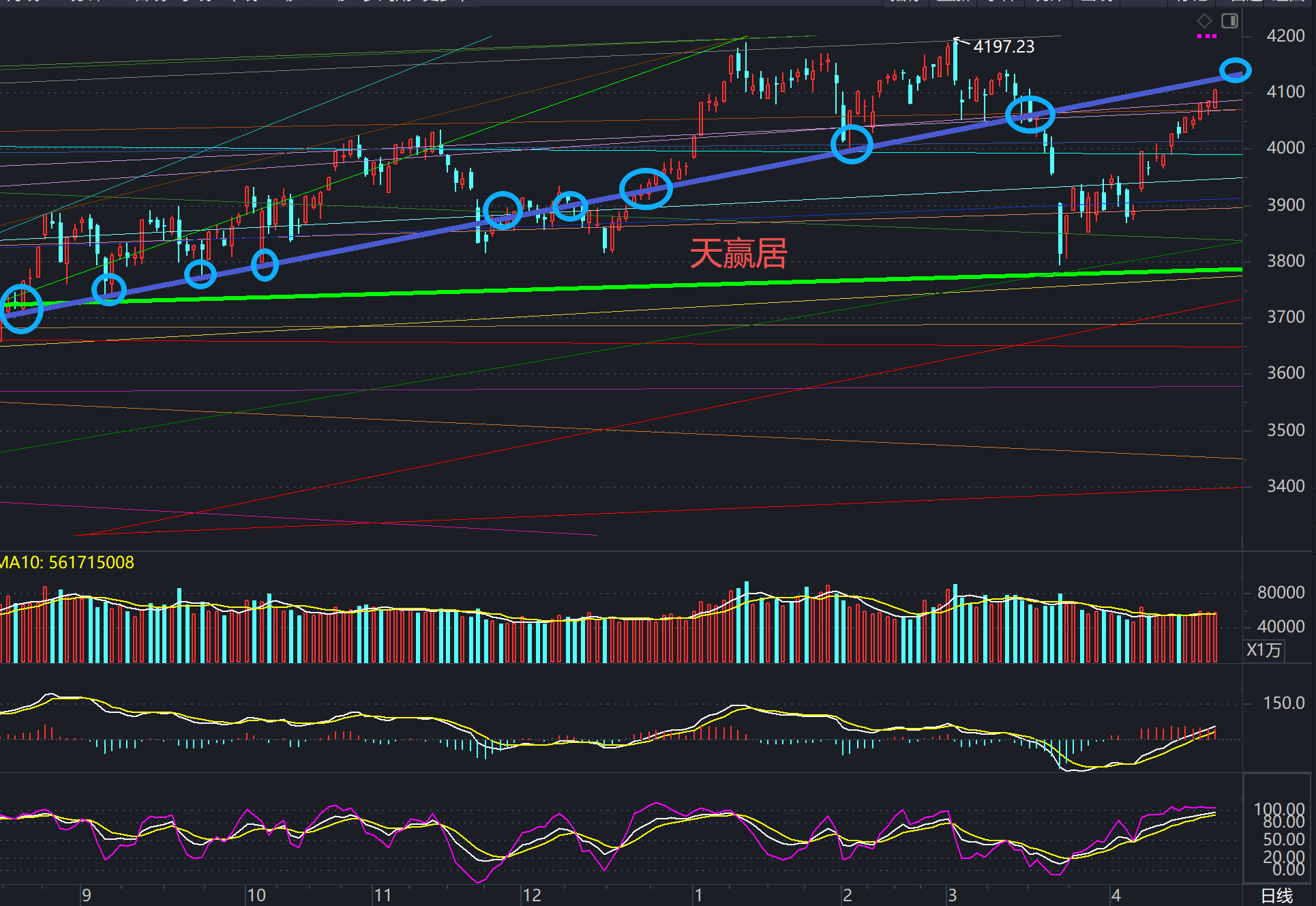 按照《天赢居趋势线的计算和使用方法》,趋势一旦经过时间、均线和趋势线多体系共振确认,就不能再简单按震荡或反弹来看待,而要顺着主升浪的思维去理解。也正因为如此,前几天在4083附近遇阻时,我们的态度始终是先谨慎,等右侧突破之后再继续看多。大盘在这个关键阻力位横盘两三天后选择向上突破,说明原有压制已经被化解,行情也因此获得了进一步延续的基础。