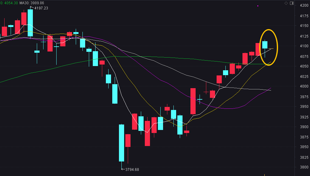 成交量有点小异动,全天突破2.8万亿,回到了三月初的水平,也就是大盘4197点的水平,既然成交量已经从坑里爬了出来,大盘的点位也理应能爬出来。
