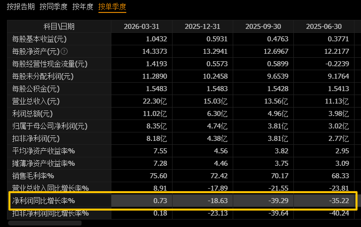 白酒今天有点异动,原因是板块内有一家公司的一季报业绩回暖,但仔细看会发现,也仅仅是净利润增速由负转正而已,并且增长幅度连1%都没有。