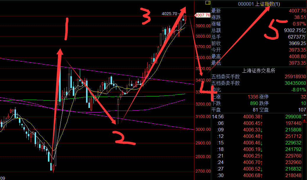 从更大的周线级别上看 主升三浪走完后就是四浪回踩了 一般来说 四浪回踩是要回踩50%的 也就是说 周线大三浪上涨了1000点,那么回踩理论上就是500点