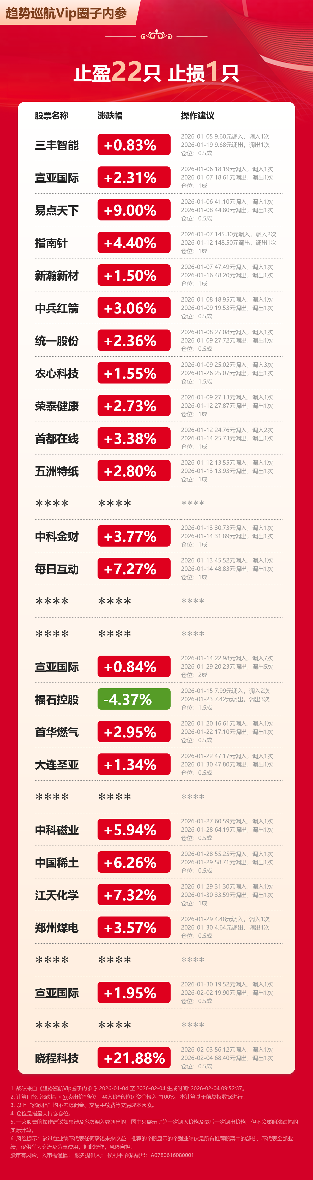 【VIP内参(含包月)战绩更新!】这是本直播室VIP内参最近一个月业绩汇总,VIP内参包含包月内参所有个股,另外还有我们看好的短线,有单独的直播室,提前添加撤离个股,请大家尽快订购。VIP圈子订阅链接:https://t.itougu.com/usyKjlV