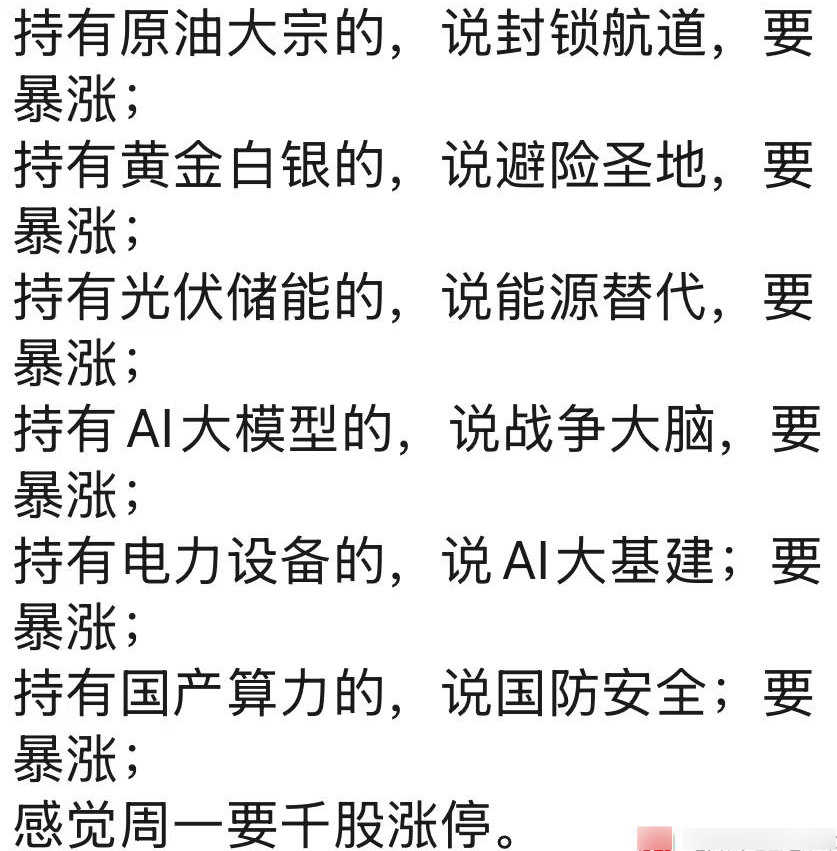 这个周末,在美国、以色列与伊朗之间的紧张局势不断升级之际,加密市场意外成为大宗商品和传统资产类别的“热门据点”。交易员为了在周末也能进行全天候对冲,正涌向这些平台寻找不间断的避险工具。黄金冲上5323美元、原油拉升5%,比特币反弹超2%。A股市场也是各种幻想都有,我们的意见是,大家尽量放弃幻想,面对现实吧!