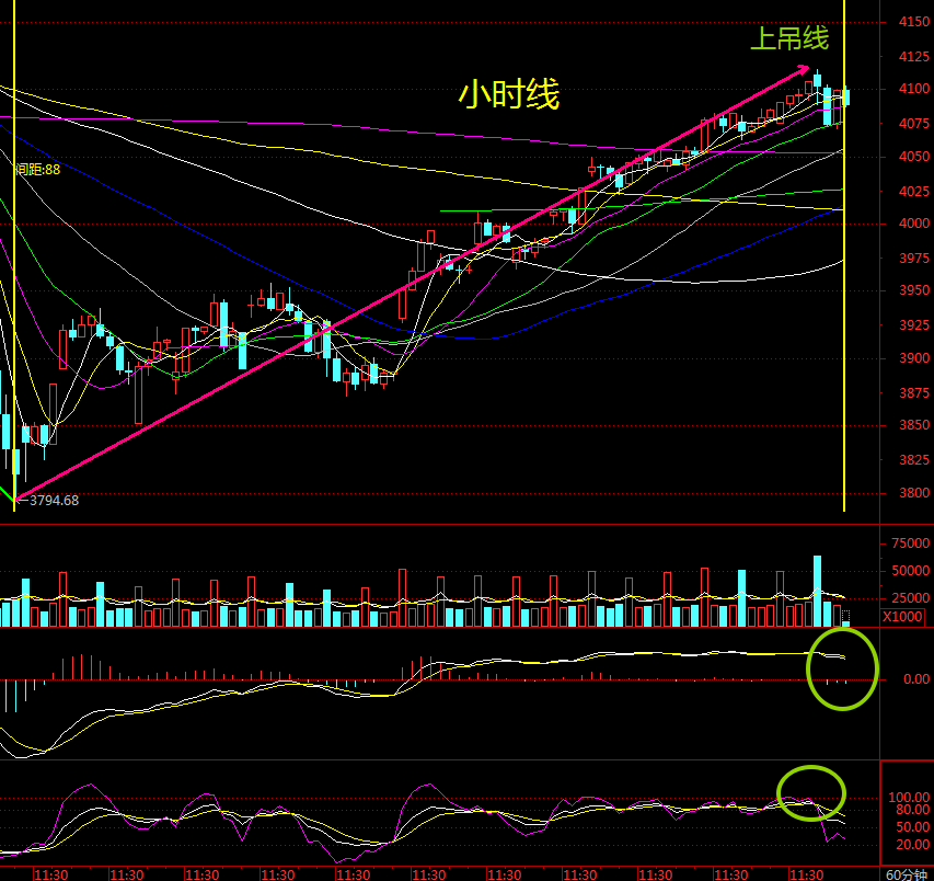 这说明大盘或个股在盘中曾经遭遇过一轮较强抛压,价格一度被明显打低,只是尾盘又被拉了回来。也就是说,虽然多头最终把价格重新托起,但空头力量已经开始显露,盘中分歧明显加大。因此,上吊线的意义并不在于当天已经彻底转空,而在于它发出了一个重要信号:上涨过程中已经出现了明显的抛售冲击,原本稳定的上升节奏开始动摇。