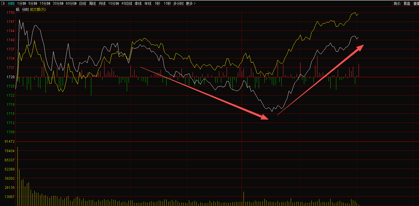铝今天这个过山车走的,这个坑明显就是在洗盘了。其实铝股的话,完全没跟上国际铝价的涨幅。国际铝价早就创年内新高了,但是铝股现在连3月的坑都还没有填完,补涨逻辑非常足,这也是今天内参看好这个方向的原因。