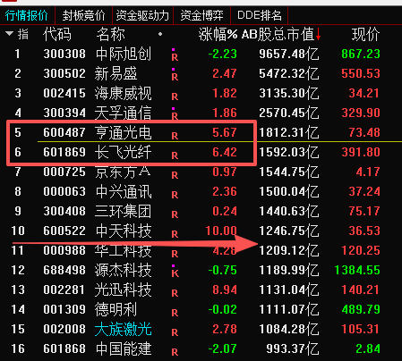 这两天大家还可以注意的就是光通信这个方向,最近调整的最多的就是他们,今天板块内已经有龙头在异动了。中天科技涨停,光迅科技目前也要冲涨停了,另外像亨通光电,长飞光钎今天也是大涨,这些龙头继续冲锋,很明显就是资金在继续关注这个方向。