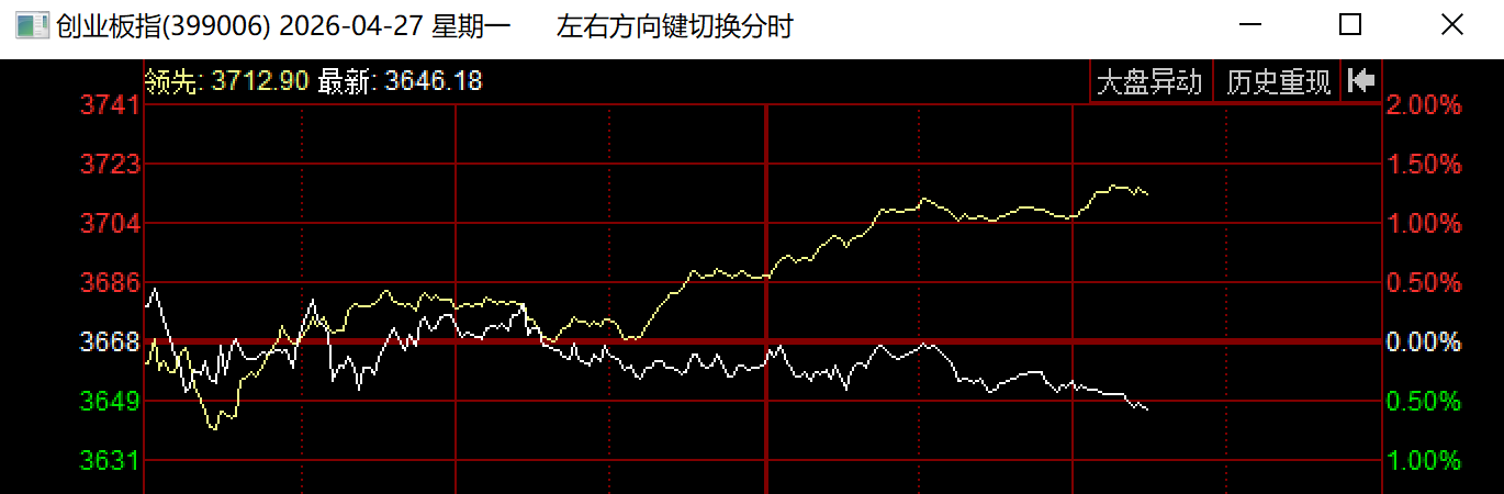 目前权重个股扛不住了,创业板很明显:宁王、中际旭创等个股领跌,不过好消息是,两市仍有超过3200股上涨,创业板个股也是涨多跌少!但黄白线张口扩大,如果权重个股继续扩大跌幅,那么此时此刻3200多股上涨的局面,可能就是今天个股的极限了!权重砸盘会把情绪带下去,个股跟风回落是大概率!投资者稳住,该高抛的高抛,该等的等,别在最后一刻被带下去!